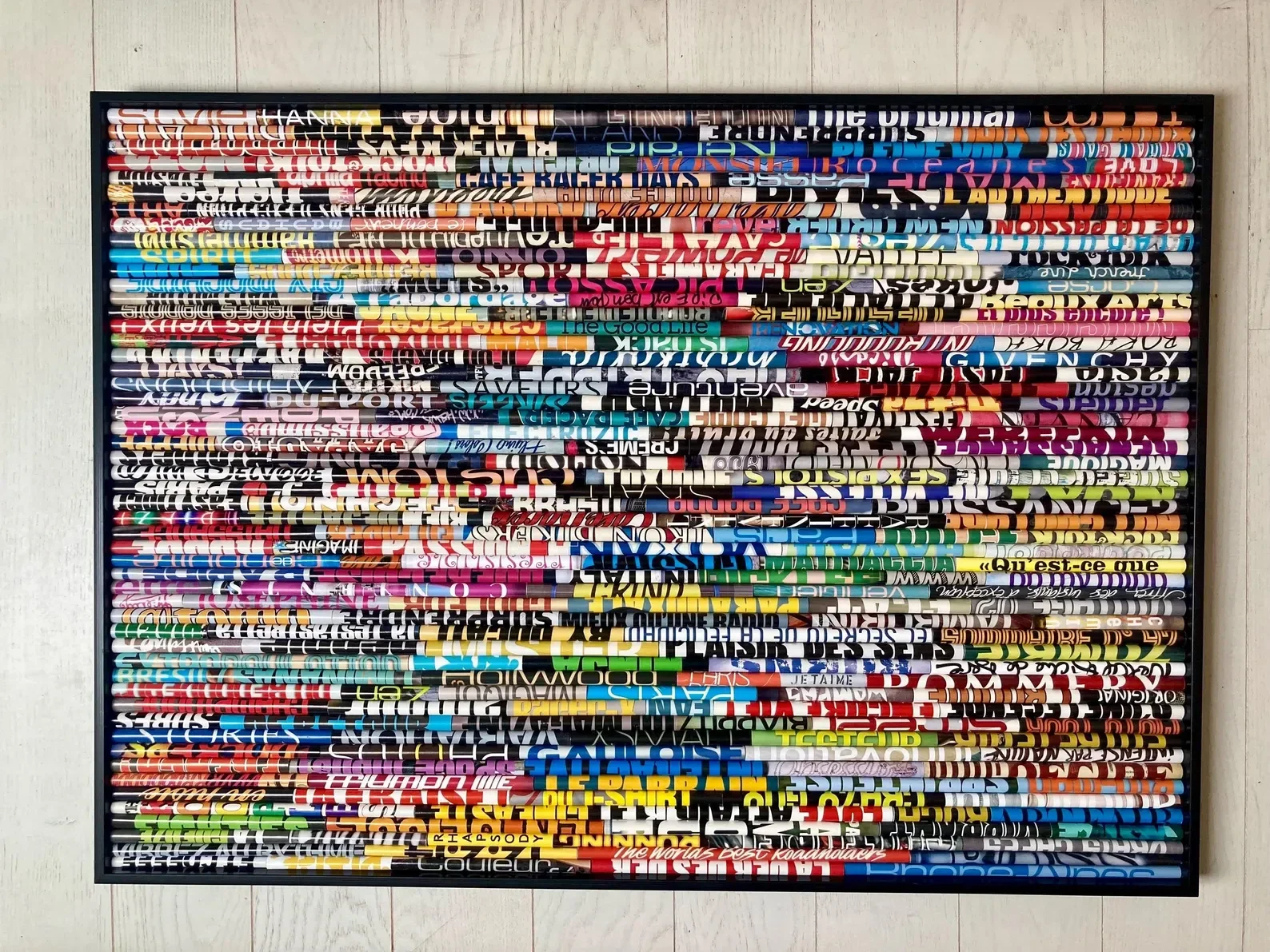 Grand tableau coloré abstrait créé avec des magazines recyclés, large frame abstract Original et curieux : A l'endroit ou à l'envers, découvrez les mots qui s'y cachent... regardez bien, et trouvez Paris