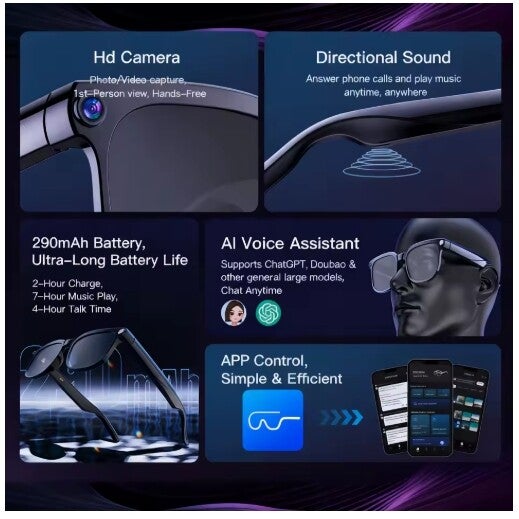 Camera video glasses, smart translation, object recognition via camera, Q&A interaction, Hi-Fi music, and high-definition calls
