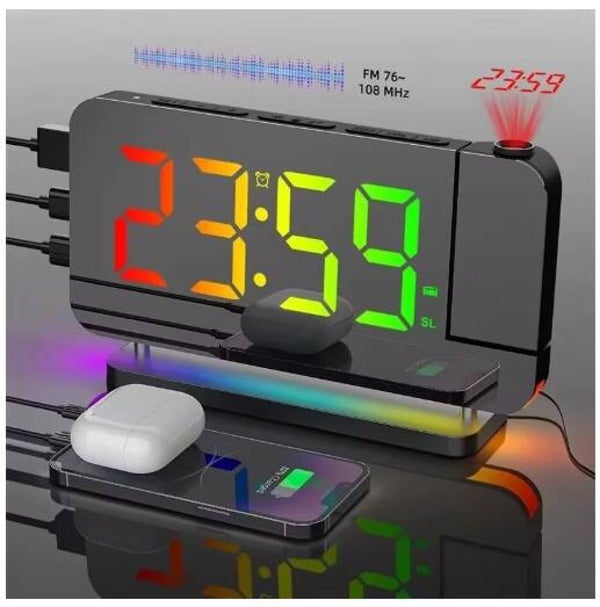 FM Radio 180° Projection Alarm Clock RGB With RGB Night Light 6 Levels Brightness Dual USB Output Port 12H/24H Digital LED Clock
